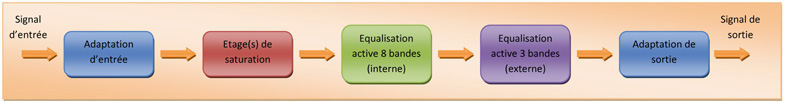 Le deuxième interrupteur permet de changer le chaînage Equalisation Interne 8 bandes <–> Equalisation externe 3 bandes (encore une fois très utile pour s'adapter à toute sorte de configuration).