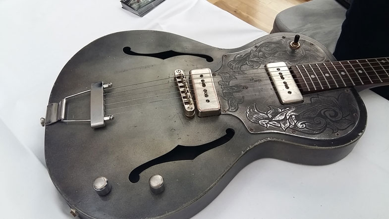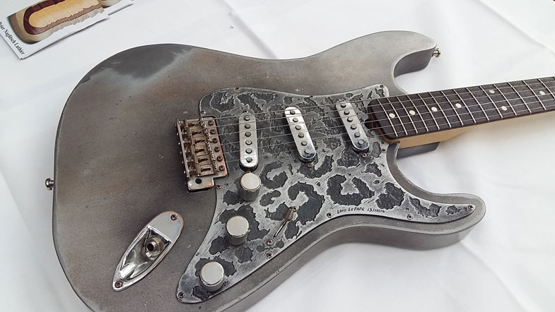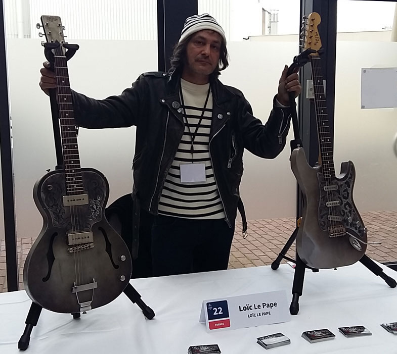 C'était sa première exposition au salon de Berlin et pour cette occasion Loïc présentait deux modèles : la Stratocasteel old silver "panther" et la LLP 1946 Engraved "Scratched" Silver.