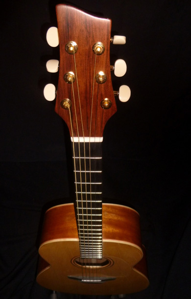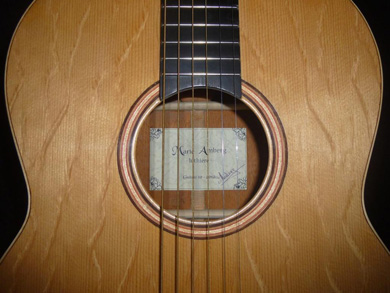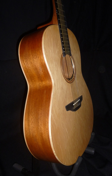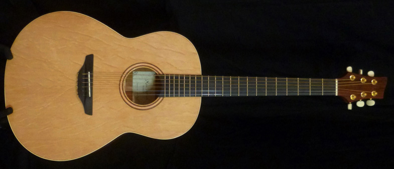 Le mot de la luthière : "C'est une 000 d'inspiration personnelle, un retour vers un petit modèle après avoir fabriqué quatre guitares Jumbo avec des tables en cèdre. Une guitare très équilibrée avec une table canadienne en épicéa griffé. Sa forme sobre et épurée allie légèreté et aisance de jeu."