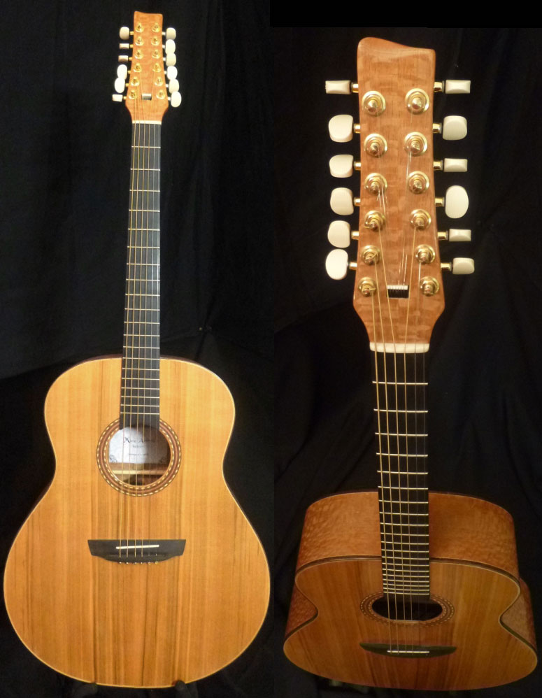Le mot de la luthière : "Voici le 2e modèle du Sympitar (un combiné de guitare et de sitar). Il s'agit d'une guitare de forme Jumbo qui comporte 6 cordes bourdon supplémentaires à l'intérieur du manche.