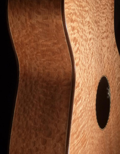 Oro Faia (fruitier brésilien). Un choix qu'il est important de souligner compte tenu de cette prise de conscience que nous devons tous avoir, luthiers et guitaristes, dans l'utilisation d'essences qui doivent se substituer aux bois exotiques couramment utilisés.