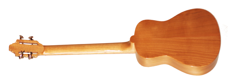 Si Mathias a respecté la fabrication traditionnelle, il y a apporté une touche respectueuse de l'environnment en utilisant des bois français autant qu'il a pu. La table est en épicéa français, le dos et les éclisses sont en cerisier, également français. le manche quant à lui est un classique cédro. Le plaquage de tête et le chevalet sont en wengé.