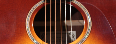 La rosace en nacre apparaît comme un vrai bijou au milieu du sunburst. La discrète plaque de protection transparente est bien choisie et ne casse pas l'harmonie générale de l'esthétisme de cette guitare.