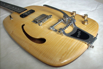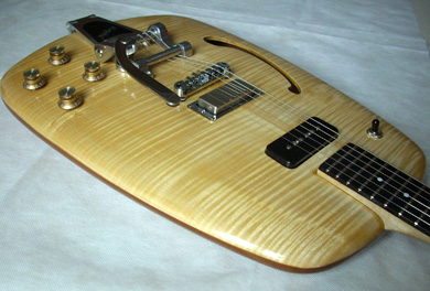 Me faire fabriquer une guitare... jamais cette idée ne m’était passée par la tête ! Pourtant en deux temps, trois mouvements Maxime a su me convaincre avec sa réunion de deux moitiés évidées et jointes telles une coquille de noix, un Bigsby, un P-90 et un mini-humbucker. Comme le point de rencontre entre une Riviera, une ES-330 et une Gretsch de Bo Diddley... Il y aurait son corps que Maxime voulait proche d’une planche de surf vintage, volée à quelque vieux prince hawaïen et la tête que je voyais plus anguleuse, presque Art-Déco, pour le contraste et l’équilibre.