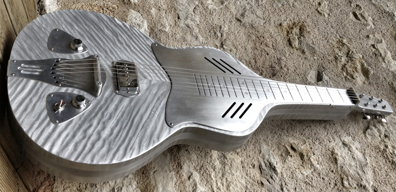 Il s'agit d'un Weissenborn qui porte le doux nom de "Aluha" (bien trouvé !) tout vêtu d'aluminium, touche, corps, manche, chevalet, cordier et barrage. Equipé d'un P90 Mississippi Queen bare Knuckle (C'est la deuxième version de ce modèle (voir la version 1)