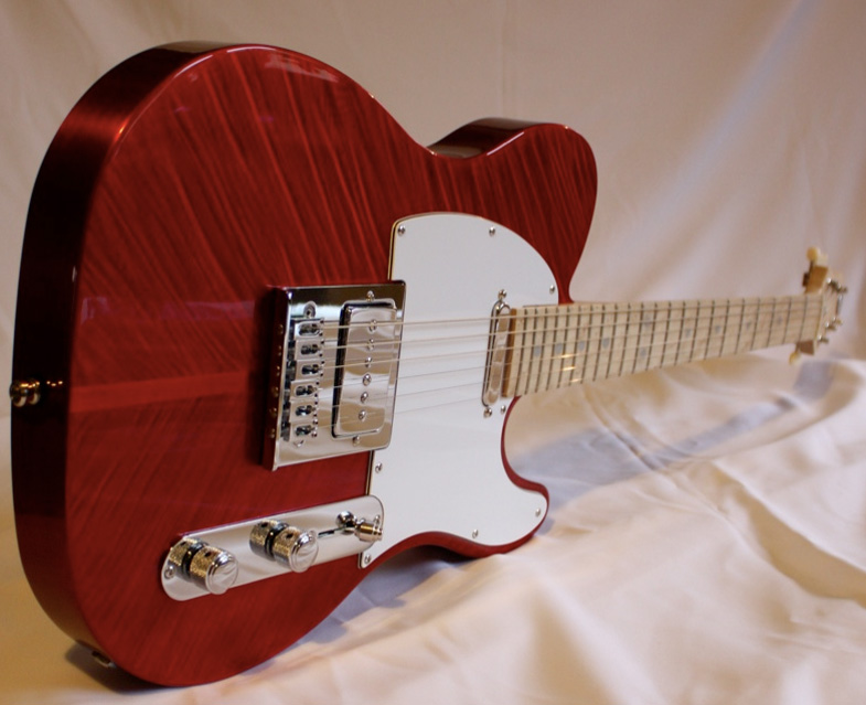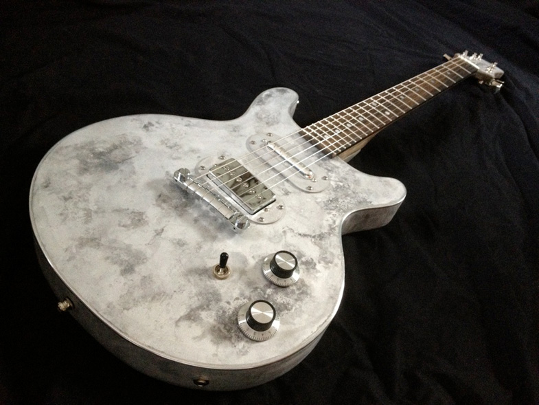 Eh oui vous ne rêvez pas, il s'agit bien d'un corps en alumium ondé. La Babydoll est le premier modèle de l'atelier à présenter de type de finition. Elle est équipée de Bare Knukcle© P90 Mississippi Queen en bridge + Brown Sugar en neck.