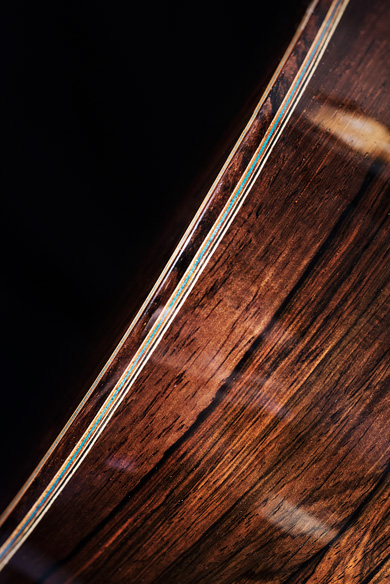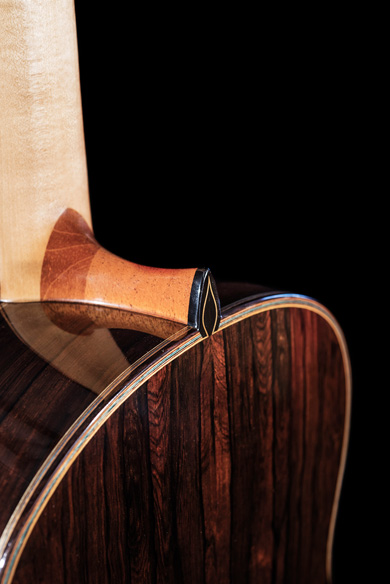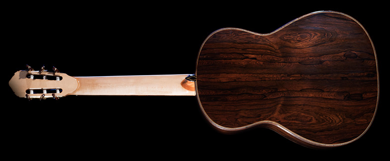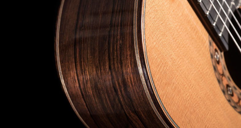 avec une table épicéa pré-alpes chenillée et un corps en palissandre de Rio.