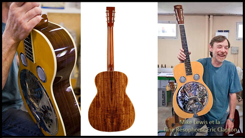 En effet, Eric Clapton a commandé à Mike Lewis une guitare à résonateur type « Dobro » (Système Spider) avec une table en épicéa et dos/éclisses en palissandre de Rio (le tout Laminate)….. un instrument Magnifique qui possède un son incroyable (j’ai pu tester l’exemplaire de monsieur Clapton).