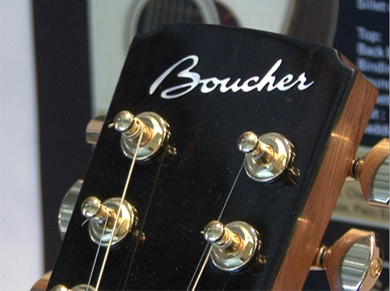 On connaissait les modèles six cordes des guitares Boucher, mais voici le modèle douze cordes de la série Studio en Bubinga pour les éclisses et le dos. L'habituel épicéa d'adirondack pour la table, un acajou sud-américain pour le manche, une touche et un chevalet en ébène.