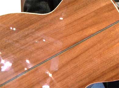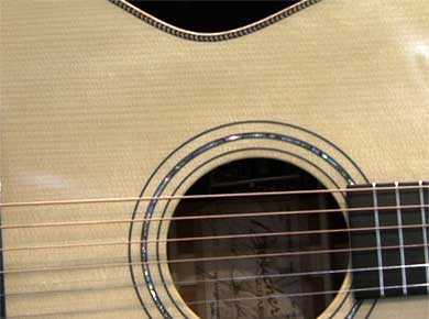 Comme son nom l'indique la Mahogany Goose OM est en acajou du Brésil pour le dos et les éclisses. Sa table est évidemment en épicéa des Adirondack. Je dis "évidemment" car si vous ne le saviez pas, les guitares Boucher fournissent les firmes comme Martin, Gibson, Santa-Cruz et bien d'autres en épicéa des Adirondacks. Le manche est en acajou, les mecaniques sont des gotoh, la touche et le chevalet sont en ébène.