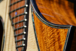 Comme vous pouvez le voir sur la photo ci-dessus, l'originalité du design et des finitions laisse présager un instrument atypique dans ses sonorités. Cette impression se confirme quand vous regardez, ci-contre, la photo sur le manche intégral !