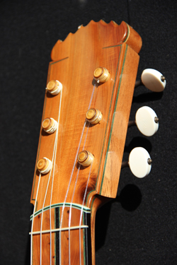 "Cela faisait longtemps que je "fantasmais" sur d'autres types de frettage comme par exemple les vieux frettages Martin en barre de maillechort qui était simplement rectangulaire et incrustés dans leur masse (cela a été un préambule pour moi) Il y a aussi le frettage baroque style cordes nouées, plus classique.