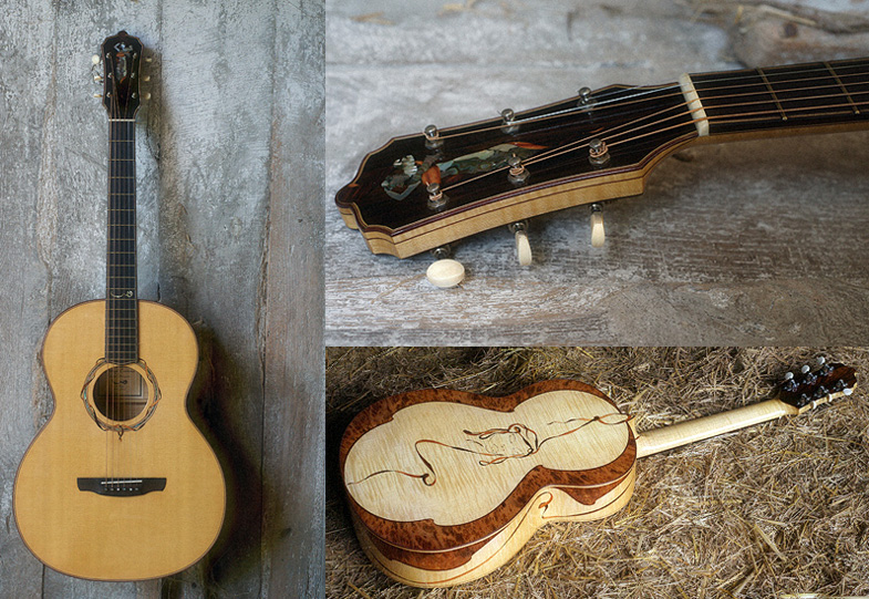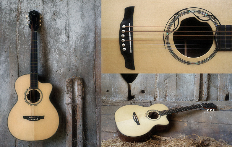Fond et éclisses : multiplis d’érable ondé avec décor de marqueterie bois de rose, de violette, amaranthe et loupe de Vavona (option massif palissandre, acajou, érable, noyer..) - Table: sitka (option épicéa) - Manche : érable ondé (option acajou, noyer..) - Touche : palissandre de Rio (option ébène) - Repères bord de touche : abalone - Chevalet : palissandre de Rio - Placage de tête : palissandre de Rio (option ébène, noyer..) - Motif sur tête : bois de rose, de violette, nacre et abalone - Incrustation repère de touche: nacre - Plaque de protection : translucide (option bois, écaille...) - Fileterie: érable ondé et amaranthe (option abalone, bois précieux) - Rosace : érable, bois de rose, bois de violette, amaranthe et abalone (personnalisée sur demande) - Barrage en X épicéa de type "scalloped" - Diapason 12 cases hors caisse: 647,7mm- Sillets : Os (option Ivoire) - Largeur sillet standard 44 mm - Mécaniques Waverly - Amplification sur demande |
