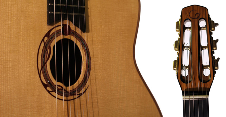 Fond et éclisses : Multipli Acajou de Cuba/Peuplier/Buis Américain ; Décor de marqueterie Amarante et Bois de Violette- Table: épicéa - Manche : Noyer - Touche : ébène - Repères touche et bord de touche : abalone - Chevalet : Palissandre de Rio - Placage de tête : ébène incrustation Buis Américain face avant et arrière - Plaque de protection : translucide (option bois, écaille...) - Fileterie: Amarante - Rosace : Amarante et abalone - Diapason 670mm - Sillet : Os - Frette 0 - Largeur sillet 44,5 mm - Mécaniques et Cordier: Dupont DR- Amplification sur demande - Livrée en étui rigide |