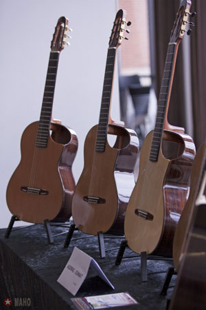 Quant à Philippe, il exposait le fruit de sa collaboration avec Gérard : un modèle jazz Nylon que je vous ai déjà présenté lors du salon à Issoudun en 2014 et un modèle de concert, hybride pouvant être monté en cordes nylon comme en cordes acier.
