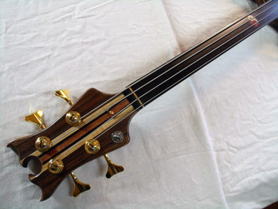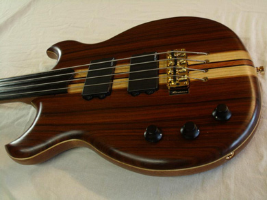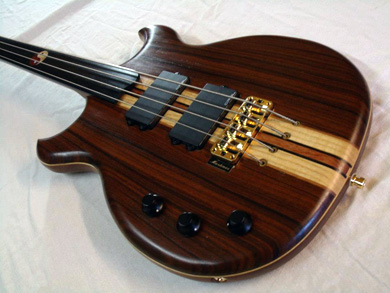 Voici une commande spéciale qu'il vient de terminer : une basse Frestless pour gaucher nommée "Fusion".