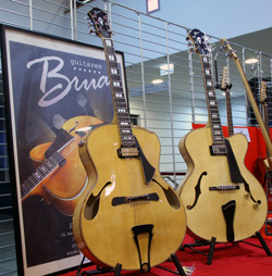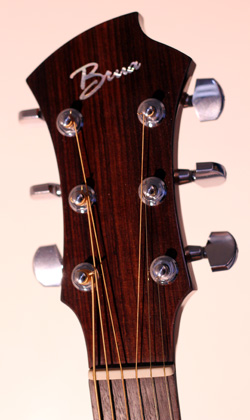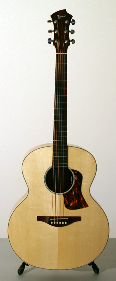 Pierrick est avant tout connu pour ses modèles arch-top dont il est un des grands spécialistes en France mais cette année à Issoudun, il a souhaité nous présenter un modèle de type OM/Auditorium aux formes sensuelles et pourvu d'une finition très sobre.