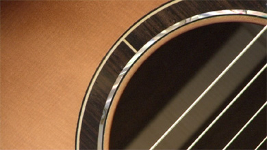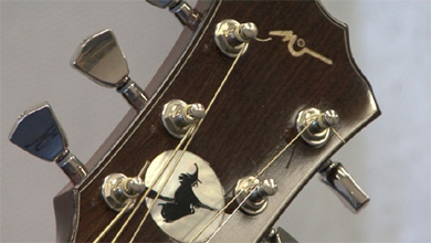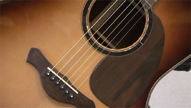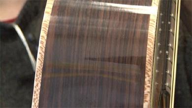 La finition est particulièrement bien réussie même si elle reste sobre. J'apprécie particulièrement la fileterie de caisse qui est réalisée avec du platane, assez original pour être signalé. Pour le reste, c'est du classique : un palissandre indien pour la caisse, touche et chevalet, de l'acajou pour le manche et de l'épicéa pour la table. Les essences sont donc idéales pour du gros son, folk, rock et blues. Encore un peu fermée, elle manque de rondeur dans les basses mais répond très bien à un coup de médiator féroce. Ce modèle est en vente à 1 600 euros. Si cela vous intéresse !