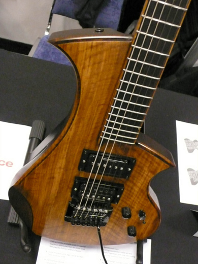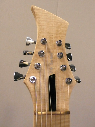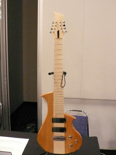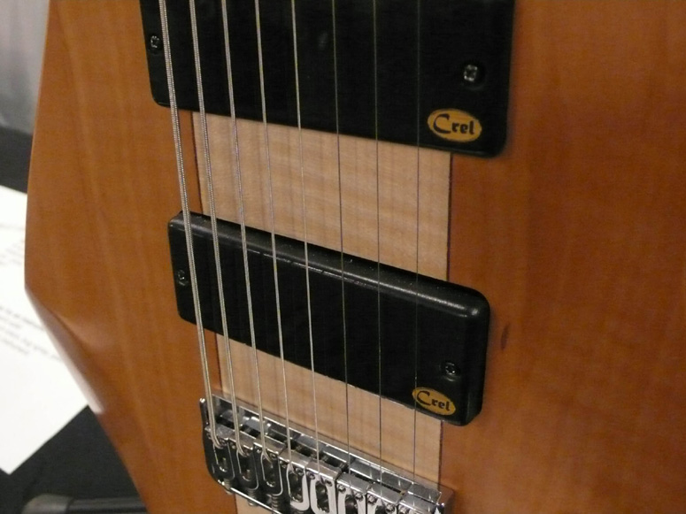 A l'occasion de la 3ème édition du salon de guitare Montréal, le luthier nous présente un modèle baryton à 8 cordes d'une forme très personnelle avec un manche conducteur et pourvu de deux micros Crel.