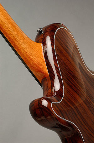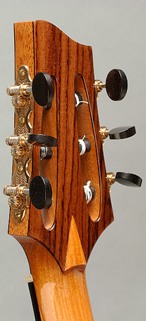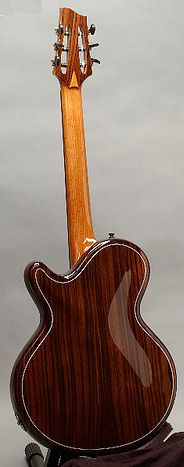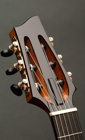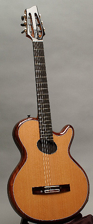 Les résultats sont surprenant: volume élevé avec beaucoup de «sustain» tout en offrant un son tout en douceur et en chaleur, les hautes sont très grasses et rondes, spécialement à la caisse (14ième fret et +) et les basses sont bien équilibrées. La guitare peut être jouée à volume très élevé sans larsen. Les micros sont une combinaison de deux systèmes de différentes compagnies en stéréo: sous le sillet (piezo de marque D-Tar) et sous la caisse des «transducers» (de marque K&K).On utilise aucun pre-amp interne ou système de batterie: la sortie est directe en stéréo, passant ensuite par le pre-amp externe de K&K ( 2 volumes indépendants pour chaque source). Un égalisateur 3 bandes pour chaque volume se situe à l'intérieur du pre-amp et peut-être ajusté à sa guise. Le système de PZ Pre de Radial (tonebone) est recommandé. |