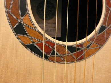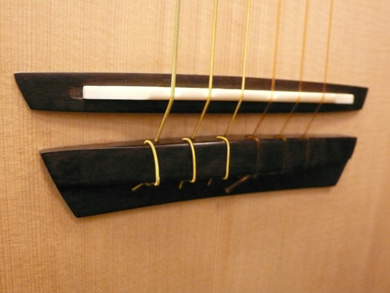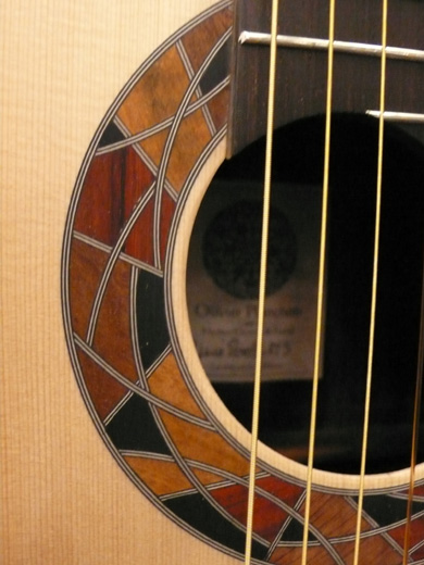 C'est donc un nouveau concept de guitare classique que nous propose Olivier avec un chevalet en deux parties, un vernis très satiné, une touche en palissandre de rio et surtout un nouveau barrage avec des barres de renfort réalisés en sandwich d'épicéa et de palissandre.
