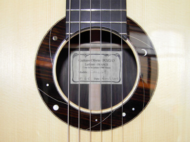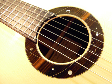 table en épicéa des alpes, le dos et les éclisses en palissandres des indes, le manche en cédro, la touche en ébène de Madagascar et la rosace en ébène de Macassar avec incrustation de filet d'érable et de nacre.