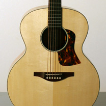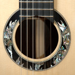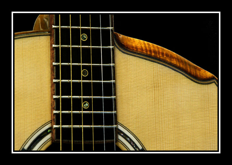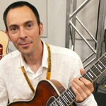 Sur son modèle OM présenté ici en vidéo, on peut noter trois nouveautés : un pan coupé d'une rare élégance inspiré du travail des luthiers canadiens et américains, cette barre de carbone (voir vidéo) placée entre les deux éclisses qui renforce la zone de pression exercée par le chevalet. Et pour finir, la dernière nouveauté vient de ses lectures du livre réalisé par Ervin Somogyi sur le travail d'allègement du barrage de fond. Sinon, la table est en epicéa, fond/éclisses en palissandre indien, le manche en cedro Honduras avec touche ébène et filets en Koa ondé.