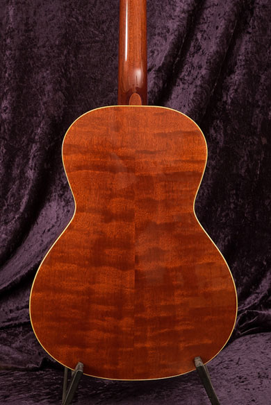 Matériaux : – Table en épicéa Allemand. – Fond et éclisses en Acajou ondé du Honduras (rarissime). – Manche en Acajou du Honduras. – Touche en Palissandre de Rio hors d'âge. – Chevalet en Palissandre de Rio et sillet os vintage. – Plaque de tête en ébène. – Mécaniques "Golden age" avec boutons reliqués. – Finitions fin vernis cellulosique haut brillant + sunburst sur la table. – Touche bombée pour le confort à la main gauche.