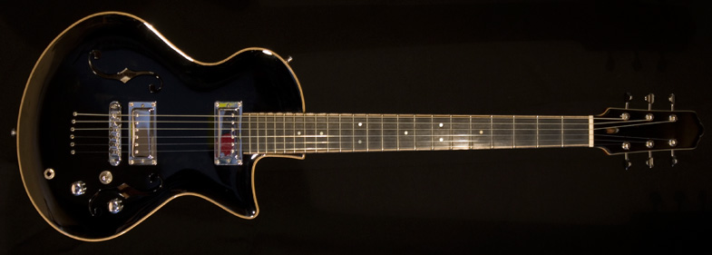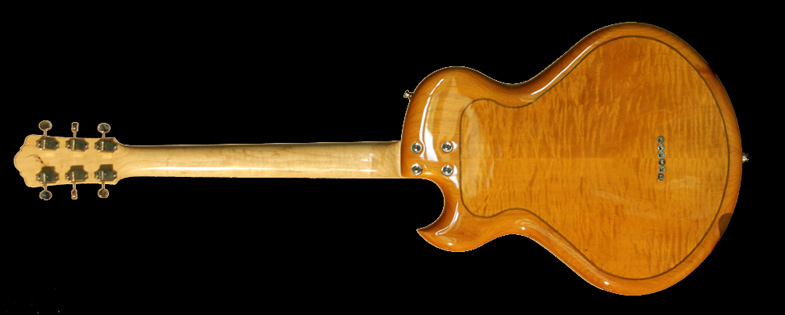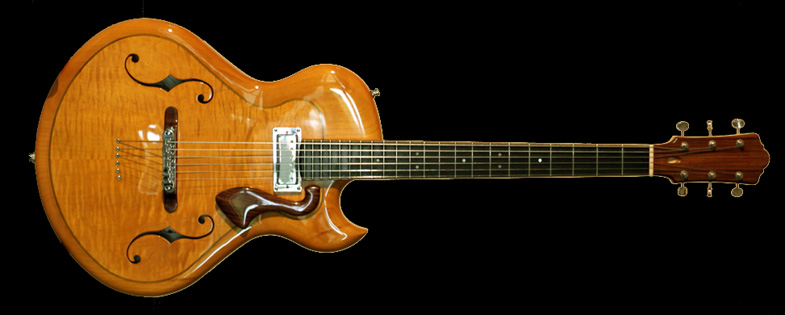 Il s'agit d'une synthèse de guitares jazz, mon intention était de développer une guitare électrique flat-top qui simule le comportement d'une acoustique. C'est ce que j'ai obtenu en calibrant le système de barrage pour induire une faiblesse sous le chevalet qui absorbe une partie de l'énergie de la corde. En contre-partie, les cordes passent à travers une âme, ce qui permet de s'affranchir de cordier et d'optimiser le sustain de l'instrument.