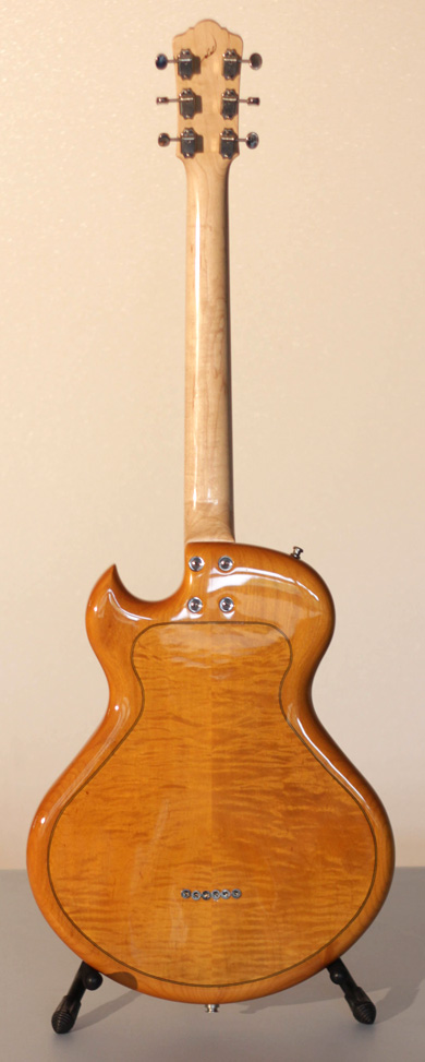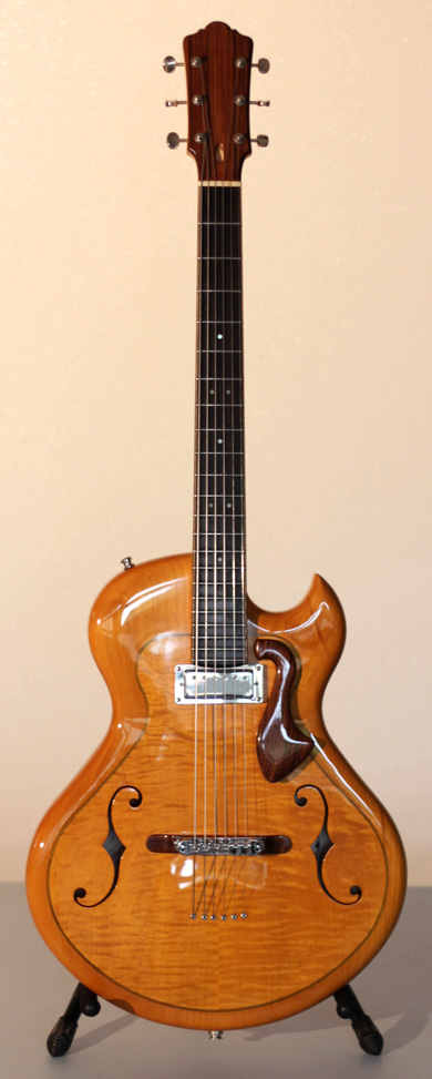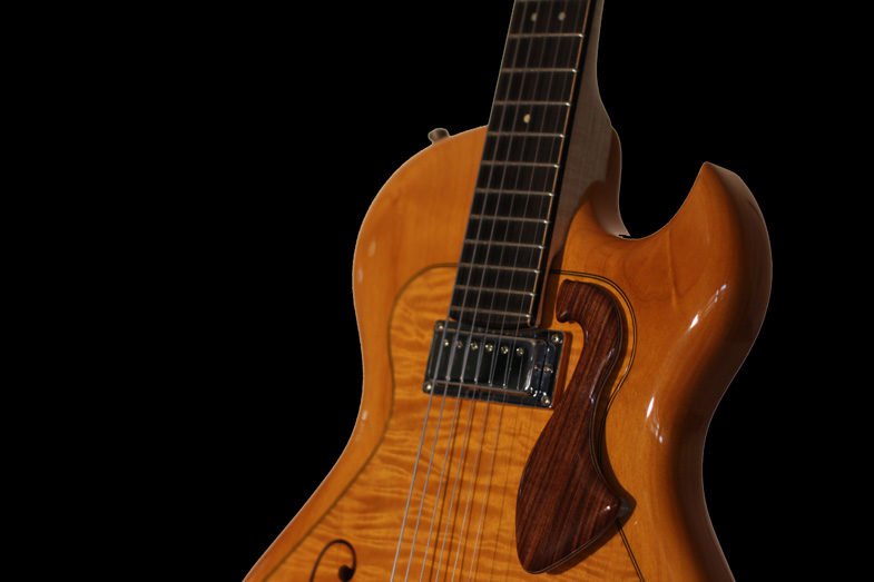 Il s'agit d'une synthèse de guitares jazz, mon intention était de développer une guitare électrique flat-top qui simule le comportement d'une acoustique. C'est ce que j'ai obtenu en calibrant le système de barrage pour induire une faiblesse sous le chevalet qui absorbe une partie de l'énergie de la corde. En contre-partie, les cordes passent à travers une âme, ce qui permet de s'affranchir de cordier et d'optimiser le sustain de l'instrument.
