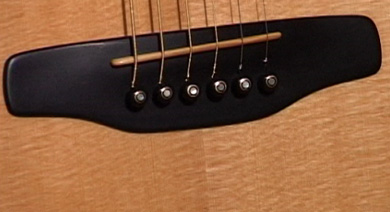 La forme du chevalet est en cohérence avec l'esthétisme général de la guitare. Avec ses formes arrondies, il est avec la tête des guitares Baudry, la signature du luthier.