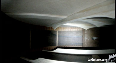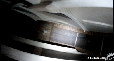 Une inspection à l'intérieur de la caisse confirme l'excellent travail du luthier. On peut y voir un barrage en X modifié par Richard ainsi que des barres de renfort du dos assez fines et très allégées.
