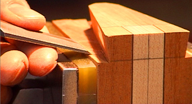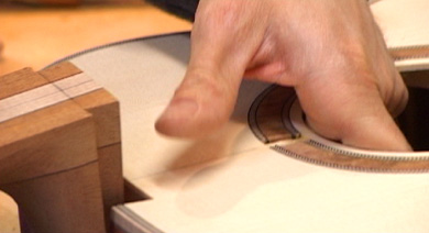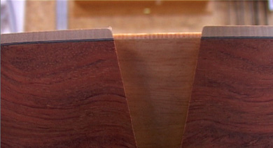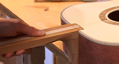 Le manche est assemblé à la caisse par le traditionnel "tenon queue d'aronde". Vous pouvez constater sur les quatre photos ci-dessus l'intelligence de cet assemblage. Durant la vie de la guitare, si le manche doit être désolidarisé de la caisse, celui-ci doit être décollé.