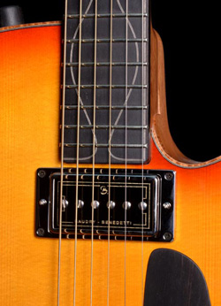 Nous commencerons par ce modèle Hybride équipé d'un micro chevalet B Band A2 2 pour la partie électro-acoustique et un magnétique Benedetti pour la partie électrique. Chacun des deux systèmes est piloté par deux potentiomètres et a sa propre sortie jack.
