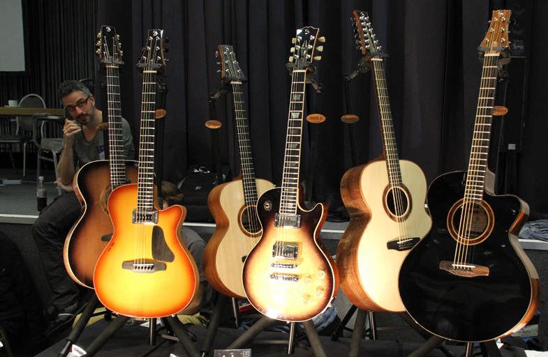 Pour cette première édition de The Holy Grail Guitar Show, Richard Baudry a exposé sur son stand un panel très représentatif de ce qu'il propose en fabrication : Folk jumbo 6 et 12 cordes et mini jumbo, OM nylon, électrique, Hybride et ukulélé.