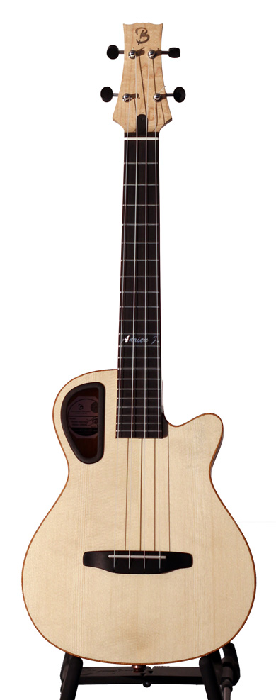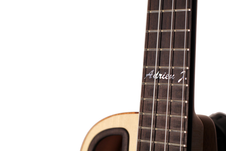 Plus que séduit par les résultats sonores et du confort du nouveau bébé Baudry, il n'a pas fallu très longtemps pour qu'un modèle signature se décide alors entre les deux créateurs. Suivant les spécificités bien précises d'Adrien, surtout concernant les cotes et profil du manche mais aussi sur le système embarqué, Richard a réalisé ce magnifique uke tenor à pan coupé electro-acoustique.