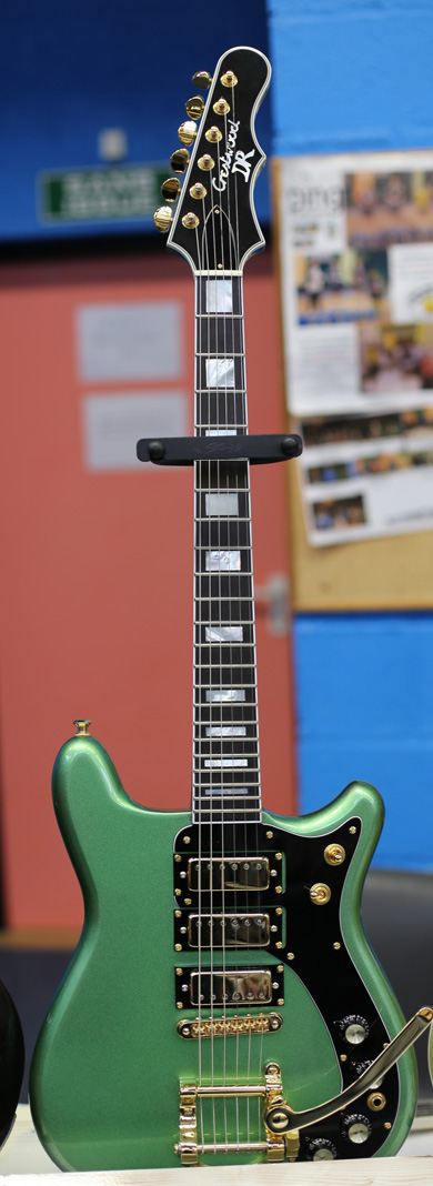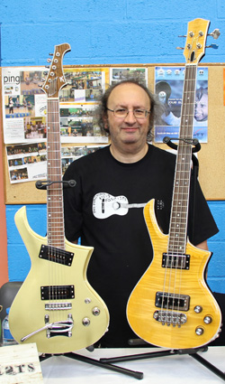 Même si la spécialité de Roger est de faire renaitre les formes et les sons des premières années phares du rock 'n' roll, sa formation de dessinateur projeteur lui a permis de créer sa propre forme que vous pouvez voir sur la photo ci-contre, sur une électrique et une basse.