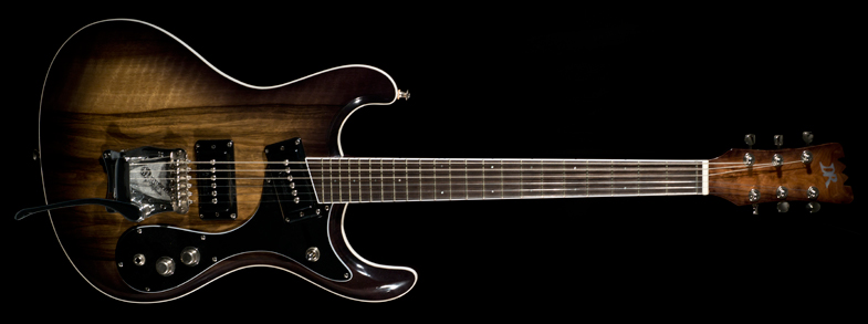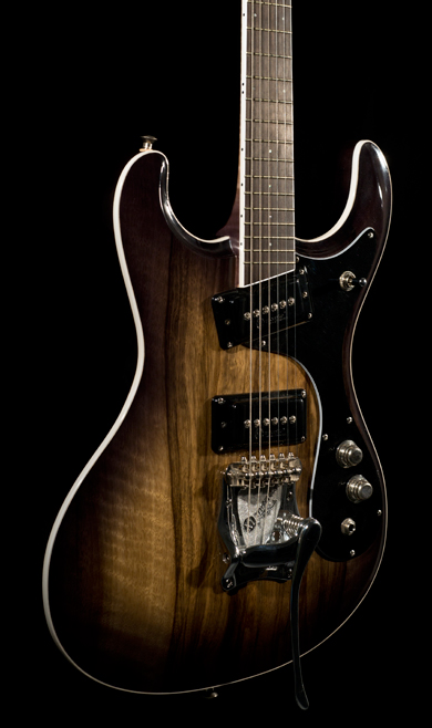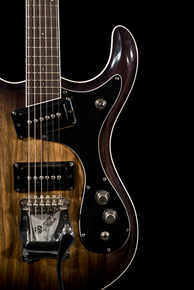Le modèle de Roger, présenté à Graines de Guitare, est une copie de ce modèle Ventures Mark I avec son corps de Strat inversé et une table aux contours moins biseautés que l'original.