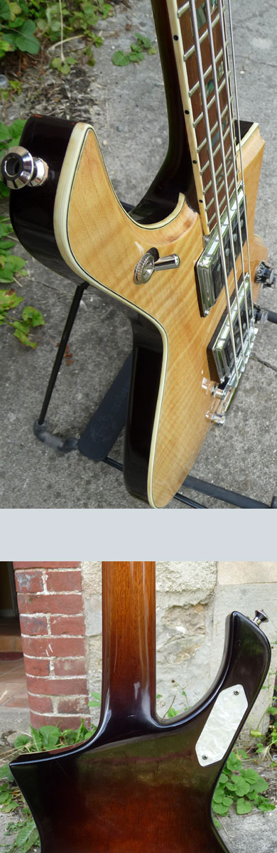 - 2 micros Daguet , basé sur la technique du BISONIC Hagstrom, 2 volumes + 2 tonalités avec 1 switch 3 positions, mécaniques sperzel 2+2, cordier et chevalet type tune"o"matic . finition cellulosique naturel.