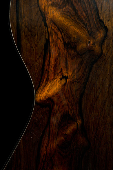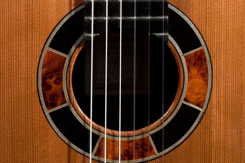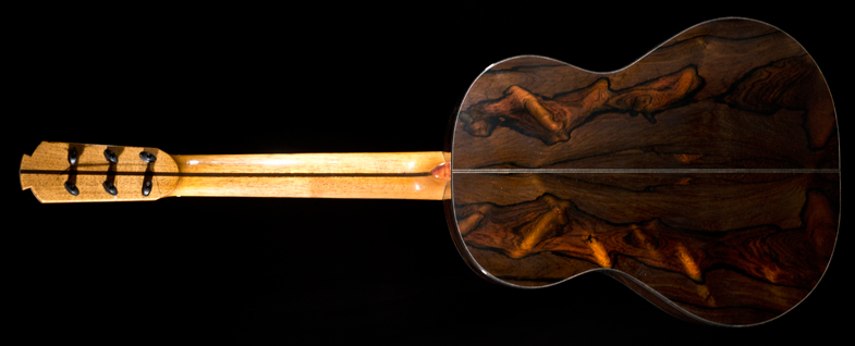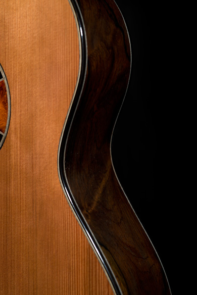 A Graines de Guitare, Romuald nous présente un modèle de concert dont la finition est remarquable. Tout d'abord, c'est le palissandre de rio du dos et des éclisses qui attire notre regard. Particulièrement figurée, cette pièce saura séduire les amoureux du genre !