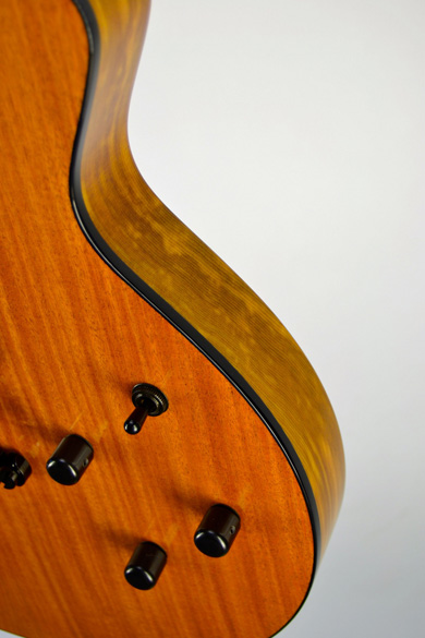 Elégance et sobriété rendent cette guitare aussi belle que si elle était habillée de nacre ou de fileterie. Le design de l'ouïe apporte la personnalité visuelle. L'acasstillage noir fait ressortir la beauté naturelle de l'acajou. Un bien bel exemple de beauté sobre et efficace. Bravo Marc !