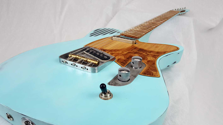 D'inspiration telecaster, les T Skin sont fabriquées en fibres carbone et donc très stables aux variations climatiques et légères (1,3 à 1,5 kg suivant la finition et l'équipement ).