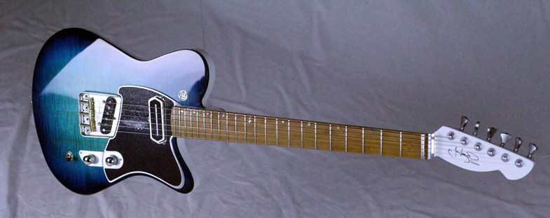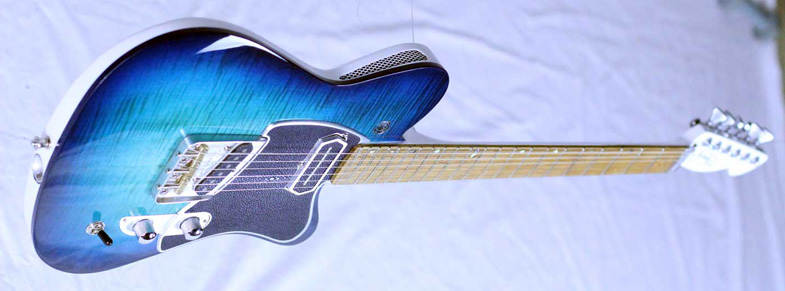 Côté son, le corps est entièrement creux et la table est en vibration. Ceci contribue à une bonne dynamique associée aux micros SP Custom de Jeremy. La touche est conique, 22 cases en bambou ou graphite, mécaniques Hip Shot, composants de bonne qualité