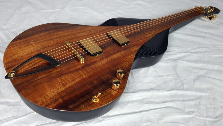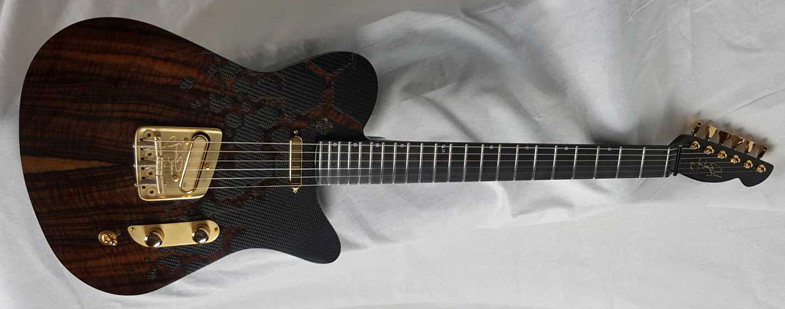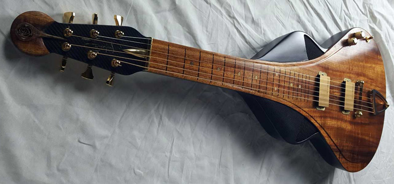 Pour le lap steel, il s'agit d un clin d œil au tear drop hawaïens des années 20, sur un corps inspiré d'une Weissenborn. La table est en Koa AAA, et tout le reste en carbone. Comme sur les T Skin, les chevalet, cordier, et autres pièces en aluminium ou laiton sont travaillées à l'atelier.