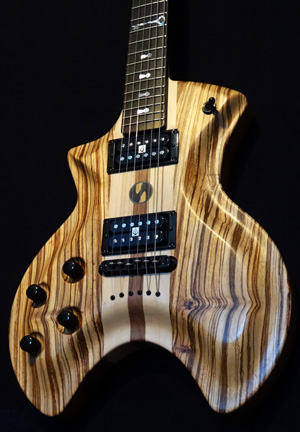 sur un corps en acajou surmonté d'une table galbée en zebrano du plus bel effet. Les micros sont des humbuckers Benedetti Rock au chevalet et Classic au manche,
