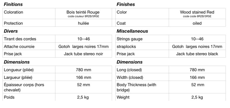 Dotée de 22 cases et d'un diapason gibson 24"3/4, d'un chevalet fixe wraparound, de mécaniques Schaller la Tour Bus version Gibson est équipée de 2 micros bobinés main par Sébastien et inspirés des PAF originaux. Micros splitables, un volume et un switch 3 positions.