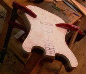 6 - Ebauche du corps a la ruban puis fixation du gabarit sur le corps ébauché pour détourer a la défonceuse,à l’aide d’une fraise a copier. |