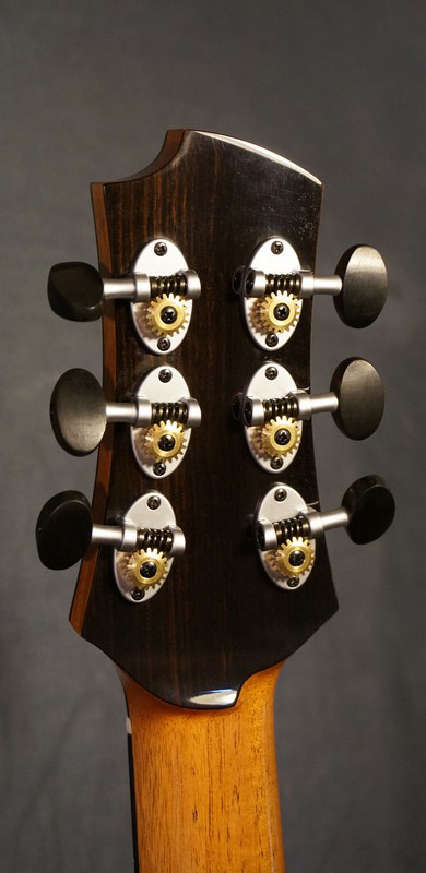 On a l'impression de la connaître déjà, tellement on se sent à l'aise de suite et sans aucun temps d'adaptation. L'action des cordes est très basse, ce qui ira à merveille pour les adeptes de finger-picking ou les strummers comme moi qui aiment bien quand ça frise ! Pour les autres, il faudra demander au luthier de réajuster cette hauteur. Les mécaniques Schertler ouvertes sont très efficaces et ont le mérite d'être esthétiquement originales.