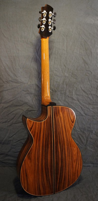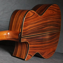 Le palissandre de santos (Pao Ferro) pour les éclisses et le dos est joliment figuré. Provenant du Brésil, c'est un bois lourd, très rigide, très dense et très résistant à la compression transversale. Il est donc tout aussi intéressant dans ses qualités mécaniques qu'un autre palissandre.
