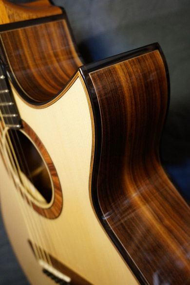 N'importe quel oeil averti saurait reconnaitre l'excellent travail réalisé. Très sobre, ce modèle affirme une subtile personnalité visuelle avec son chevalet asymétrique, le pan coupé florentin, le design de la tête et sa rosace en palissandre de santos